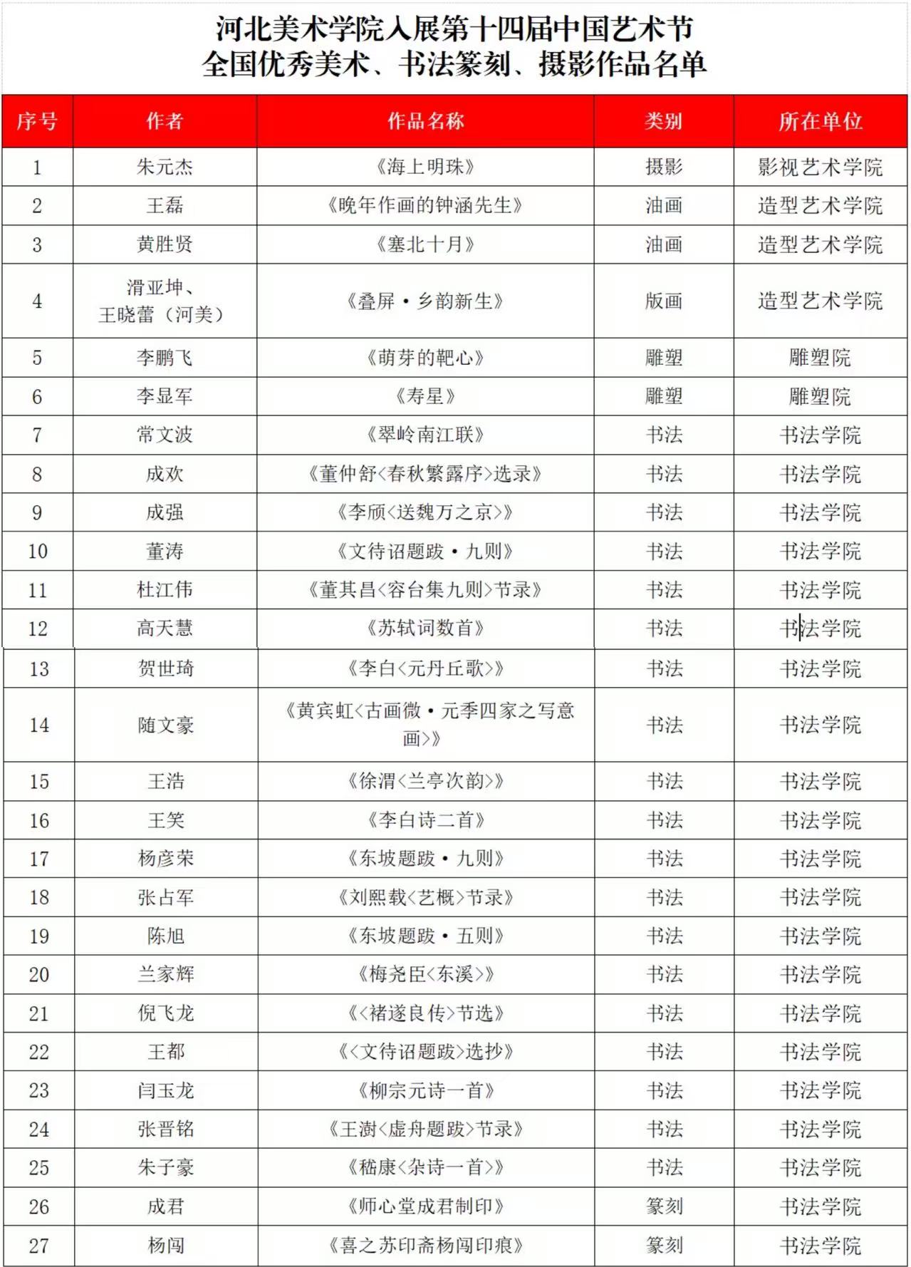 近日,由文化和旅游部、重庆市人民政府、四川省人民政府共同主办的第十四届全国艺术节优秀作品名单正式揭晓,我校师生创作实力再获国家级权威认可,27件作品成功入展,其中教师作品19件、学生作品8件,涵盖摄影、雕塑、油画、版画、书法、篆刻六大艺术门类,入选数量与覆盖品类均创我校历史新高。