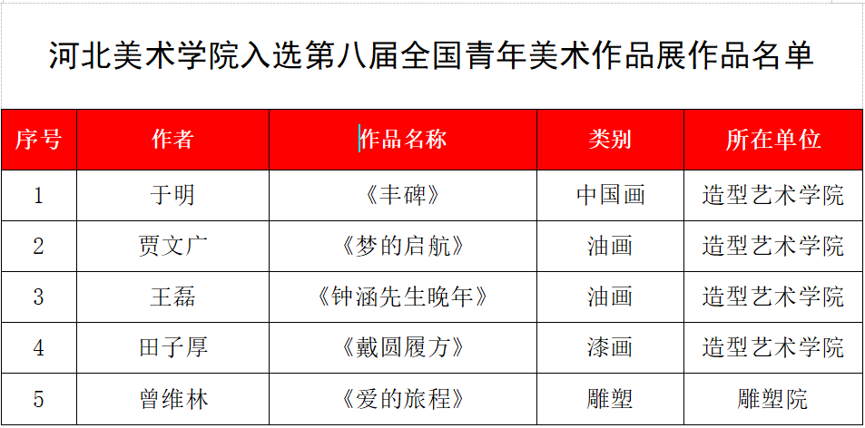 近日,由中国美术家协会、重庆市委宣传部、重庆市文学艺术界联合会共同主办的第八届全国青年美术作品展览复评结果正式揭晓,我校5件作品入选,充分展现了学校青年艺术创作者的专业实力与艺术创新活力。