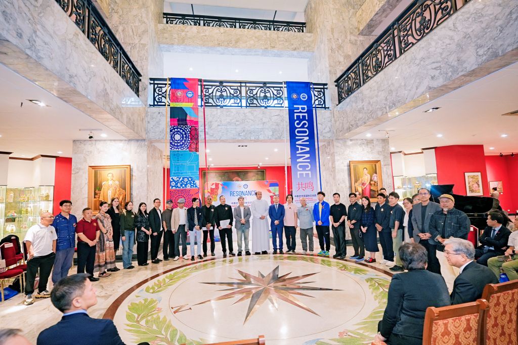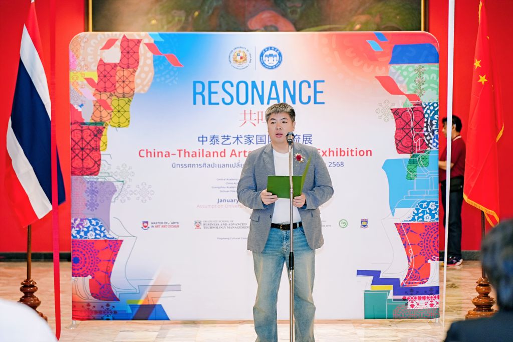 1月17日下午,“共鸣——中泰艺术家国际交流展·泰国展站”在泰国易三仓大学素万那普校区博物馆开幕。展览汇聚中泰两国多所高校艺术家,通过绘画、雕塑、装置等多样艺术形式,集中呈现当代艺术在不同文化语境中的探索与表达,持续推动中泰艺术领域的学术对话与文化交流。中华人民共和国驻泰王国大使馆教育参赞许兰,泰国高等教育、科学、研究与创新部高等教育委员会副主席基蒂猜·特里拉塔那西里猜 教授(Assoc. Prof. Dr. Kittichai Triratanasirichai),泰国易三仓大学校长西里猜·丰色卡博士(Rev. Bro. Dr. Sirichai Fonseka),河北美术学院常务副校长张建敏,联合国教科文组织乡村创意与可持续发展教席、北京大学教授向勇,中央美术学院国际交流处处长王川等出席开幕式。